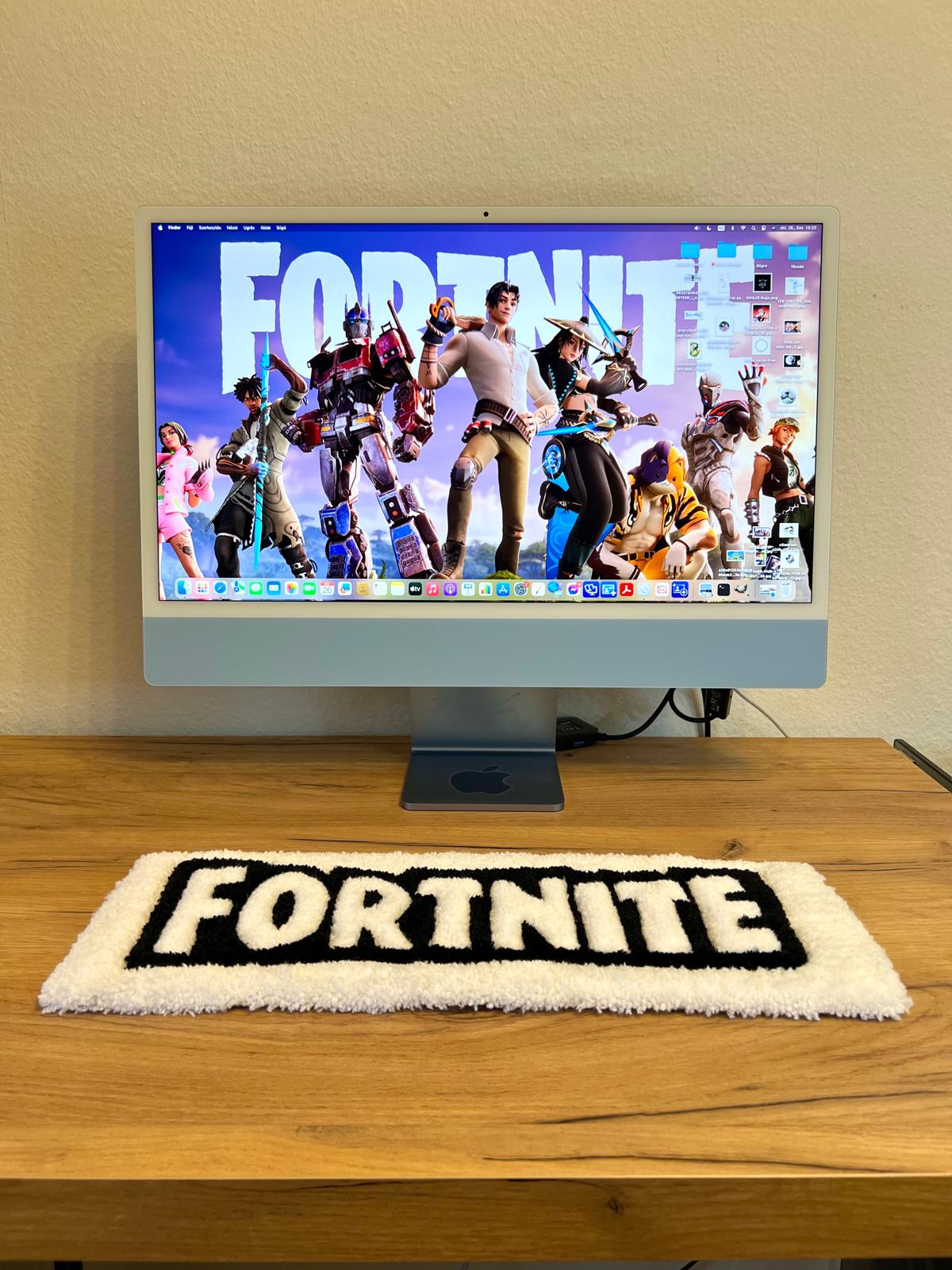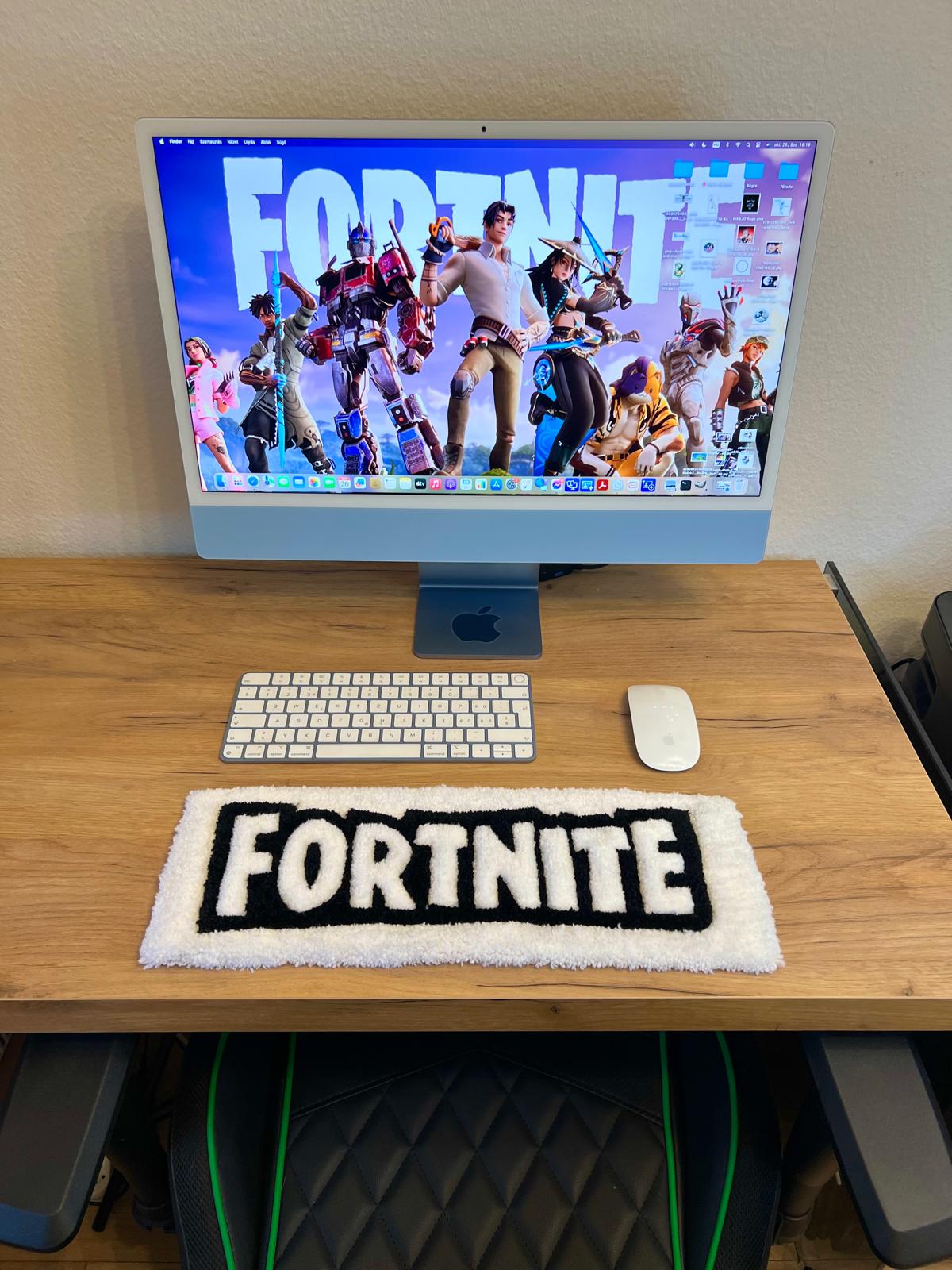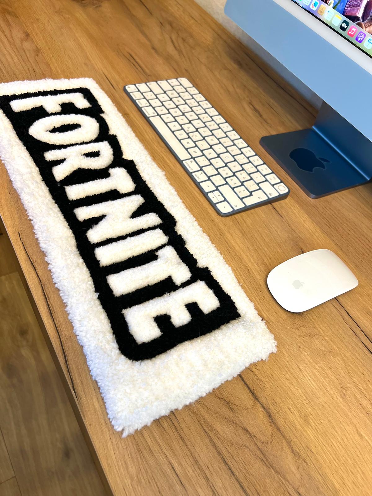 Custom handmade hand tufted Fortnite keyboard carpet, made with acrylic material. The bottom of the carpet is made of non-slip material.