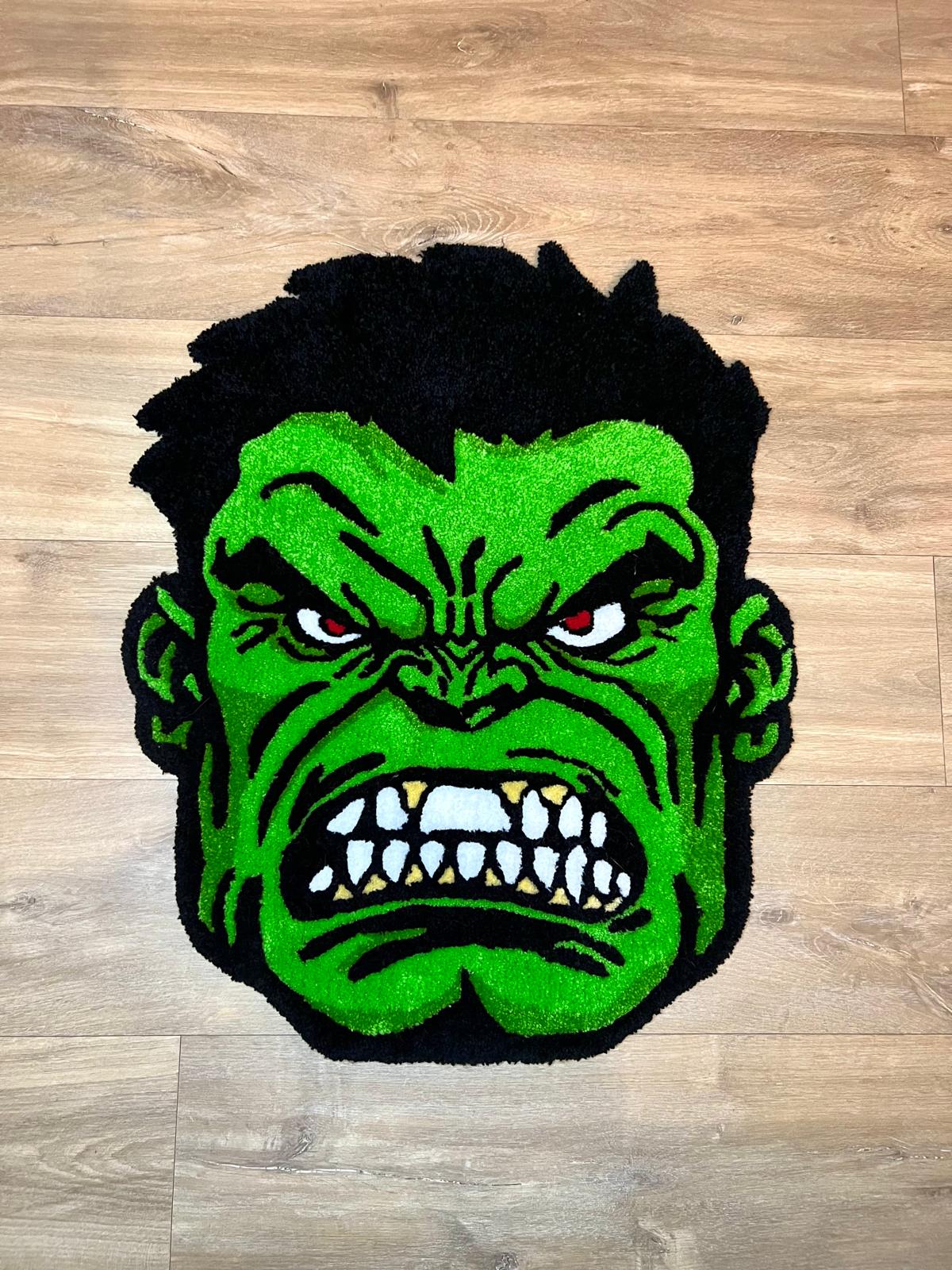 Custom handmade hand tufted Hulk Smash carpet, made with acrylic material. The bottom of the carpet is made of non-slip material.