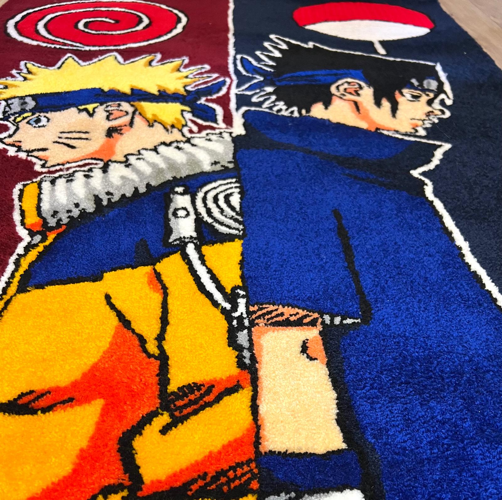 Custom handmade hand tufted Naruto and Sasuke carpet, made with acrylic material. The bottom of the carpet is made of non-slip material.