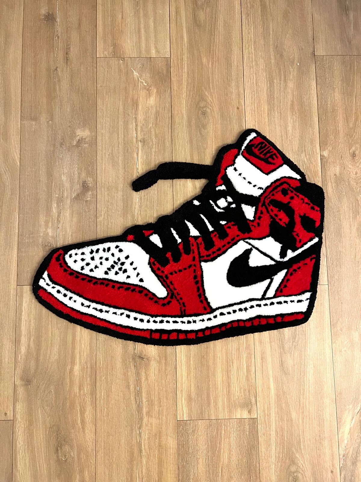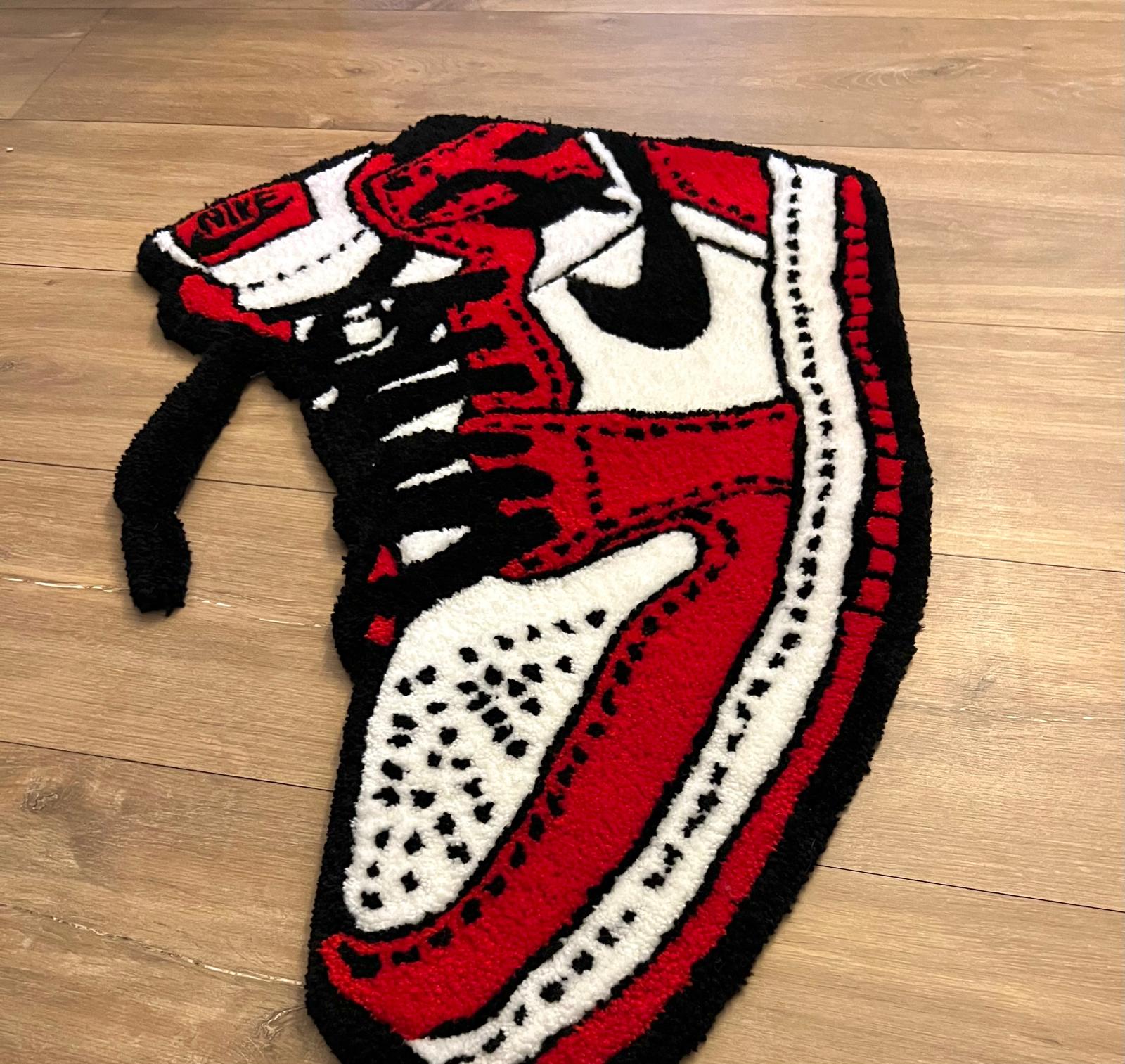 Custom handmade hand tufted Nike shoe carpet, made with acrylic material. The bottom of the carpet is made of non-slip material