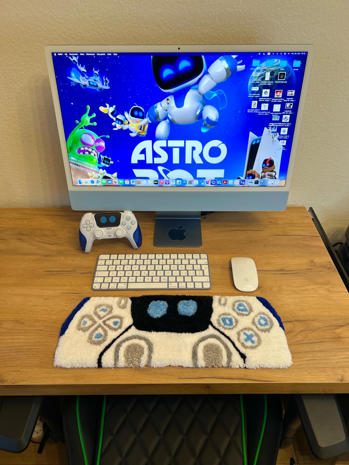Custom handmade hand tufted Playstation Astrobot keyboard carpet, made with acrylic material. The bottom of the carpet is made of non-slip material