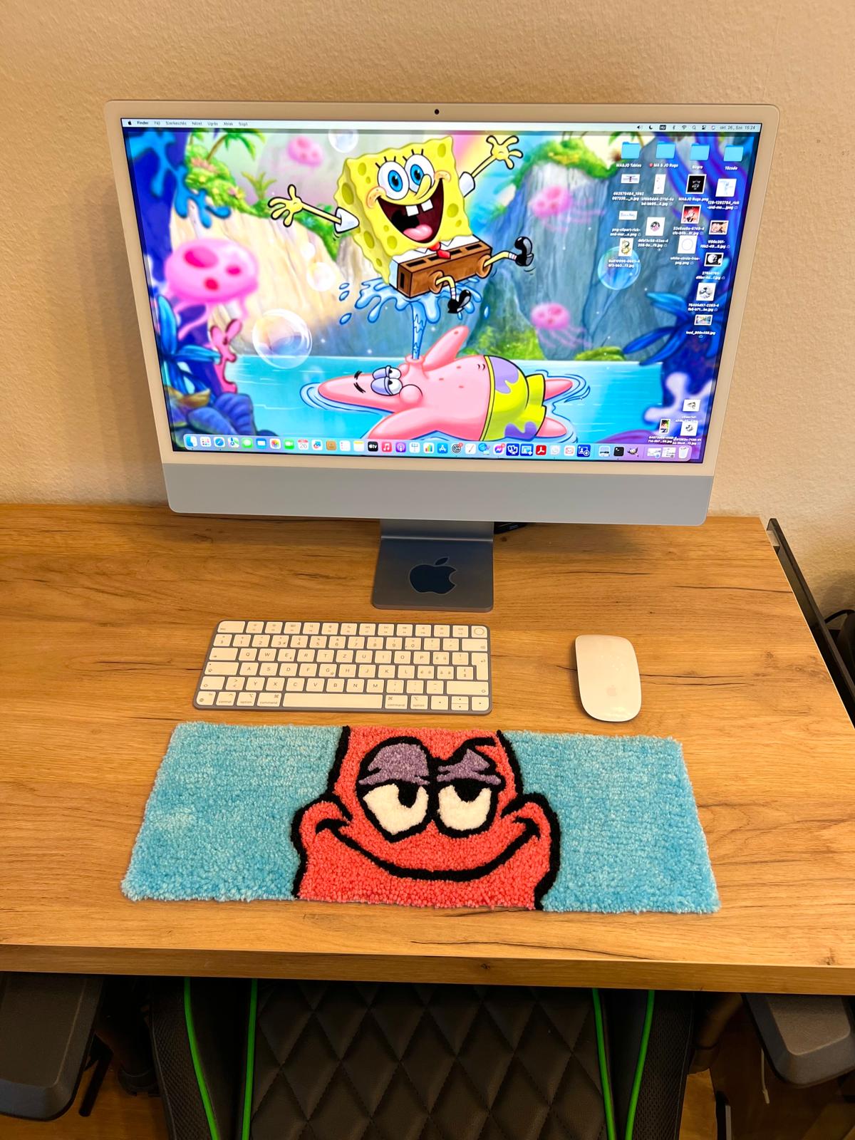 Custom handmade hand tufted Spongebob-Patrick keyboard carpet, made with acrylic material. The bottom of the carpet is made of non-slip material