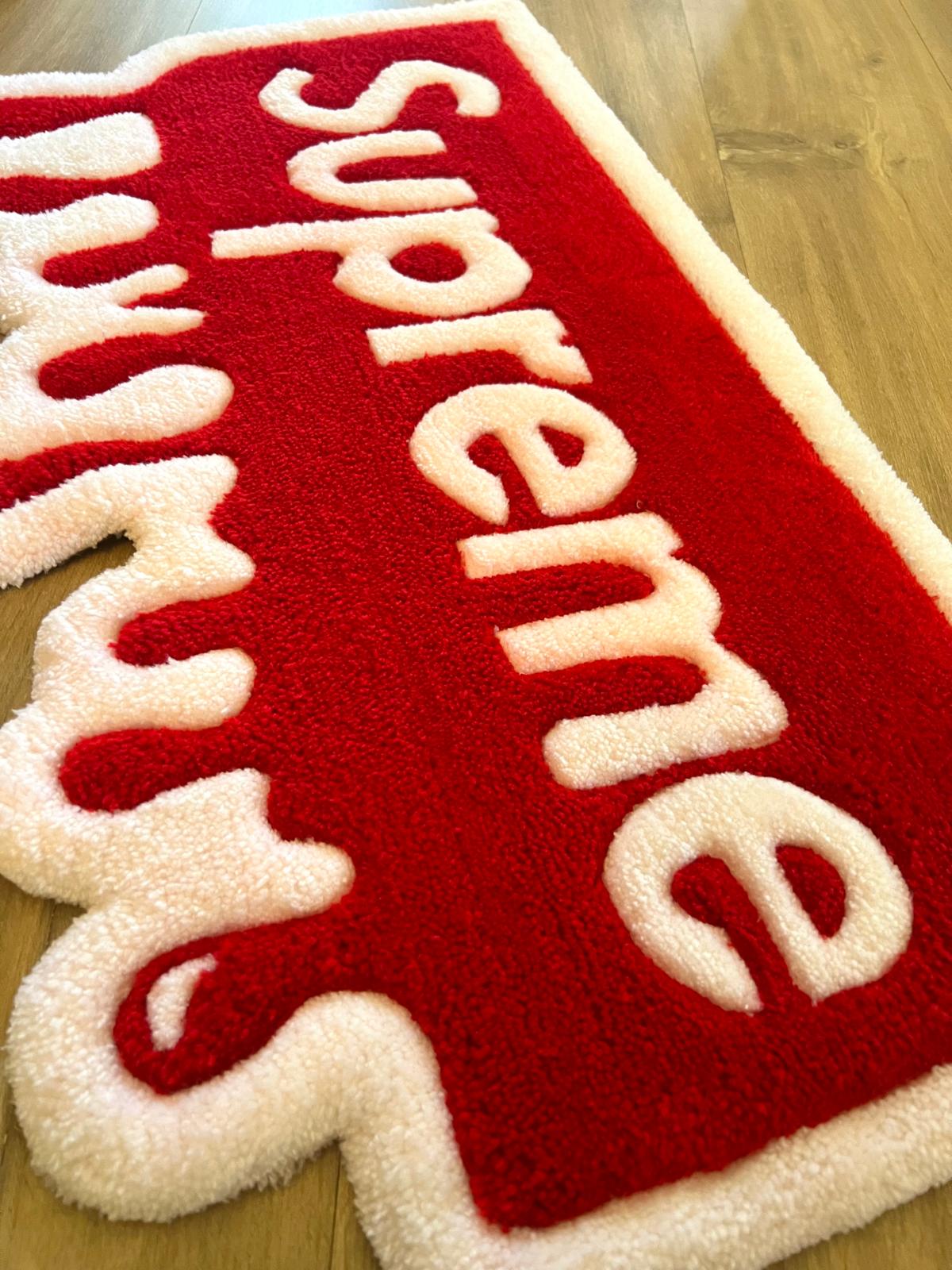 Custom handmade hand tufted Supreme carpet, made with acrylic material.