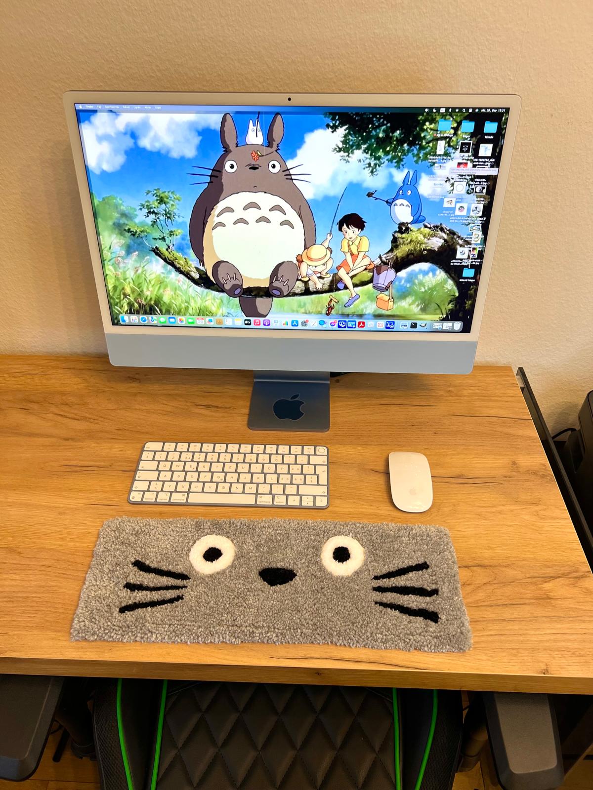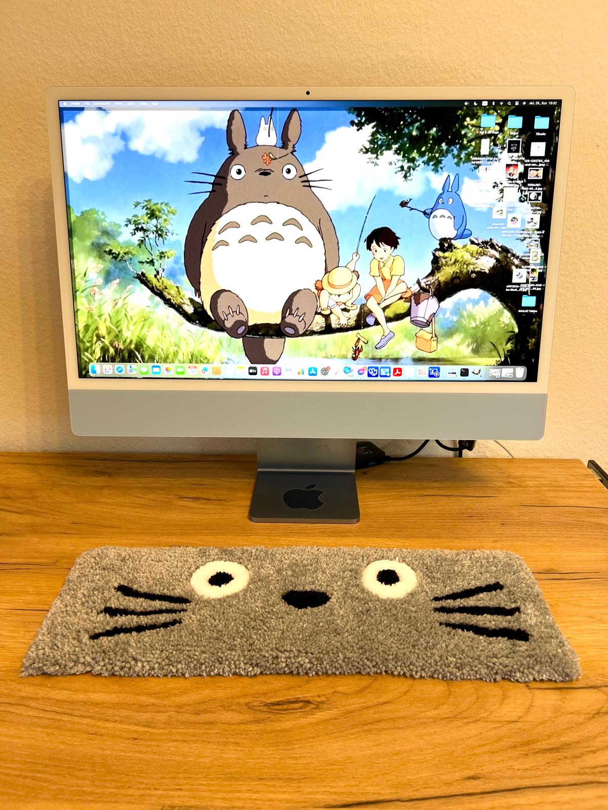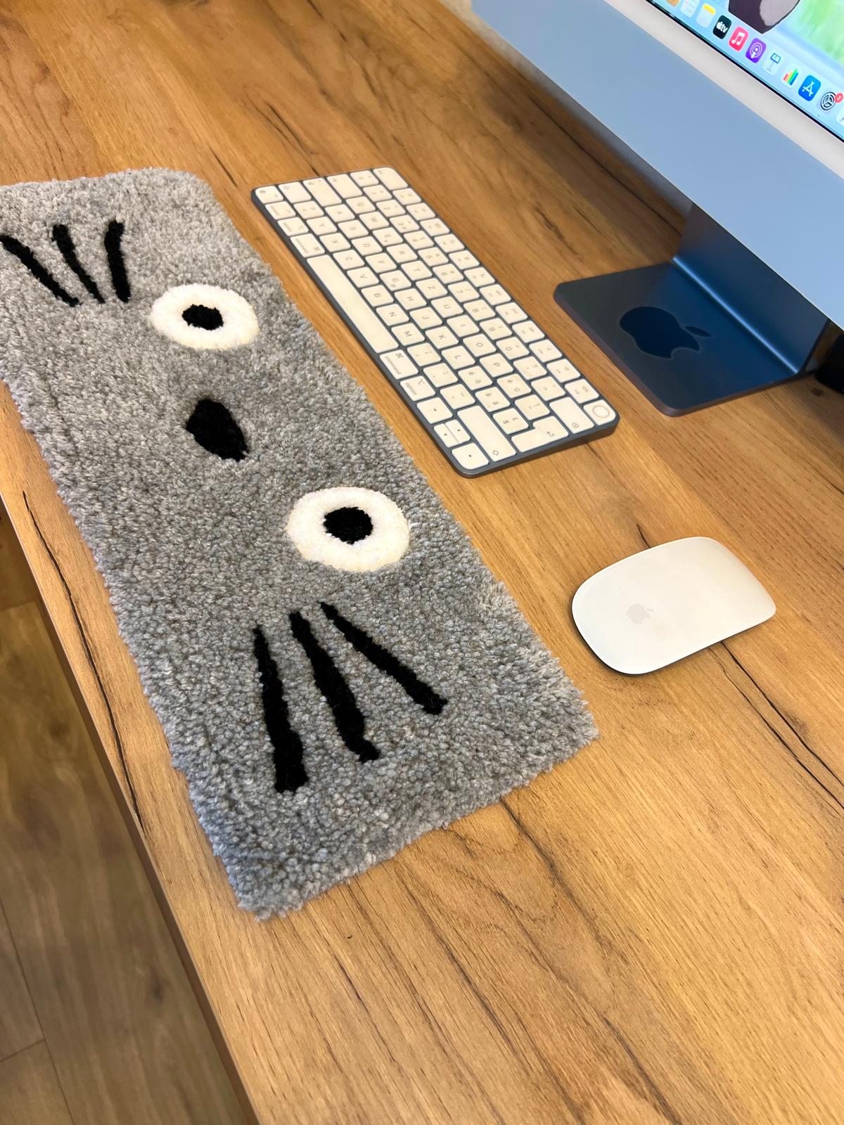 Custom handmade hand tufted Totoro keyboard carpet, made with acrylic material. The bottom of the carpet is made of non-slip material